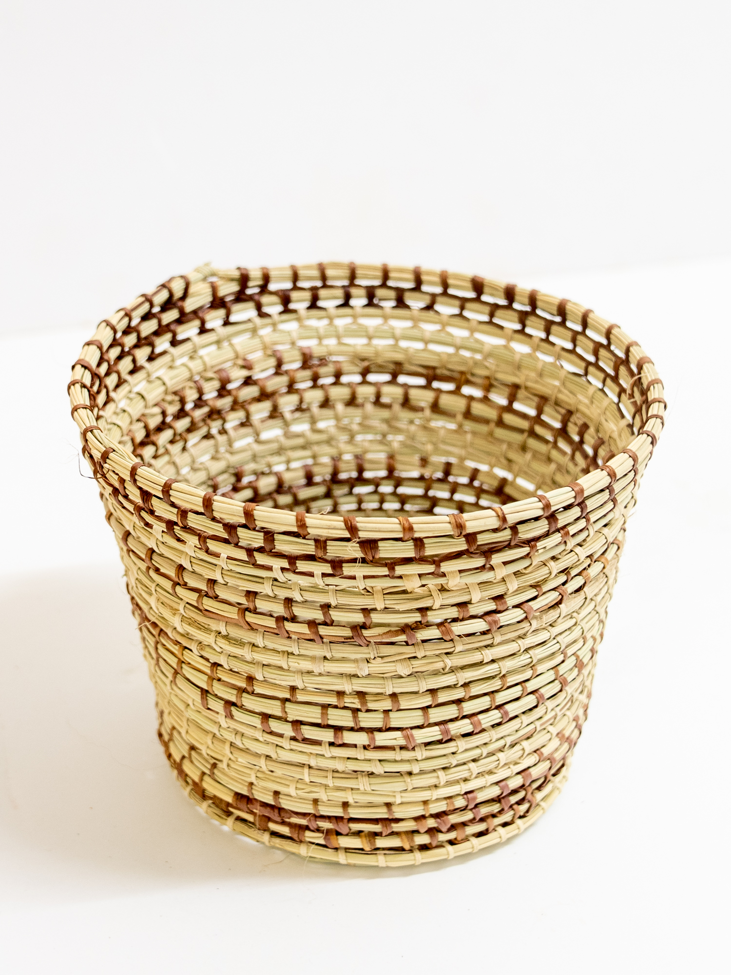 This basket is made from natural, local materials sourced from the Gunbalanya area. Weavers gather fresh young leaves from the pandanus palm using a hooked stick, then strip and dry them. The pandanus is then boiled up on the campfire with local plant dyes.