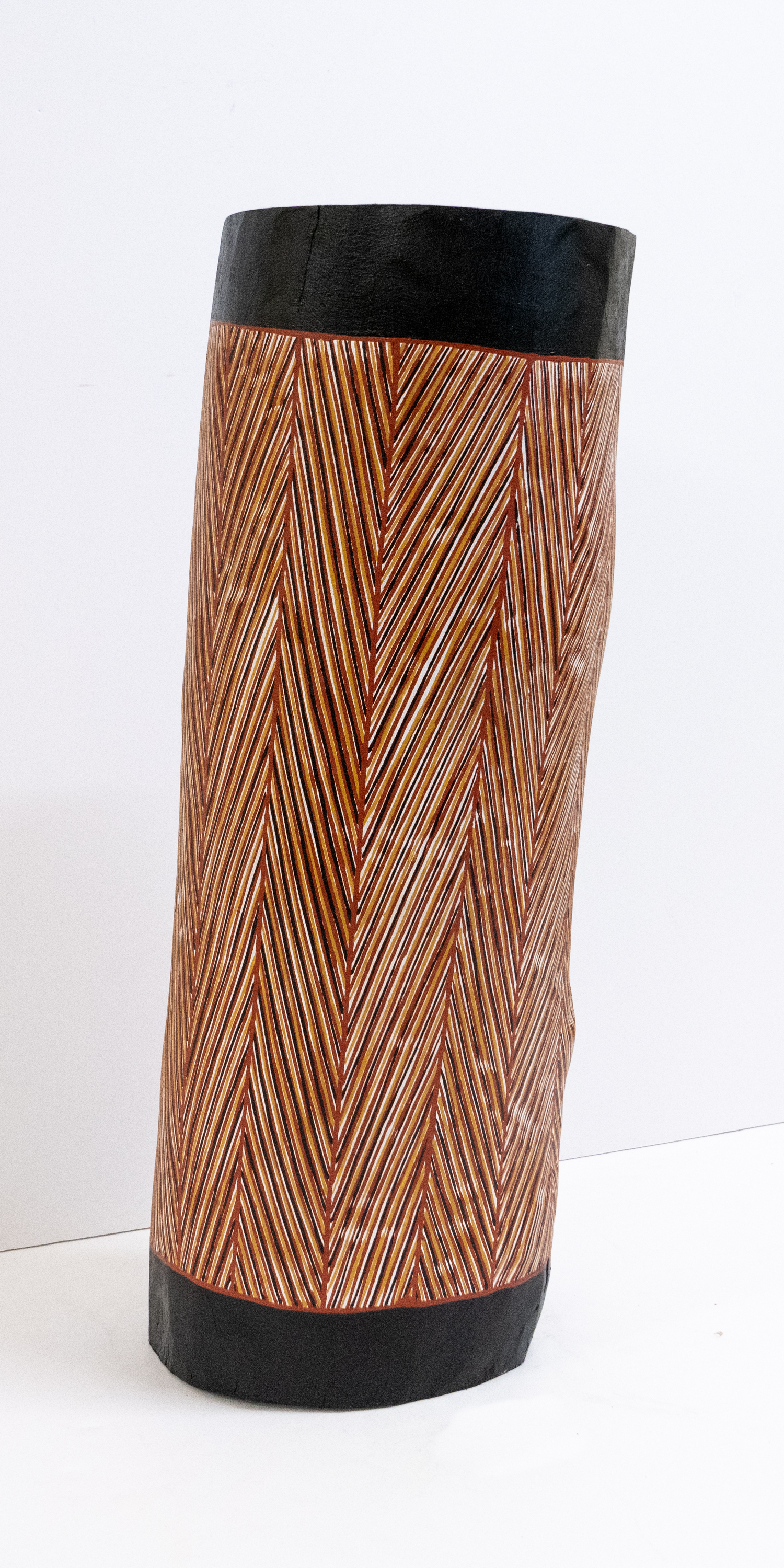 The Lorrkon is a log, naturally hollowed out by termites, which was traditionally used as a coffin for burials and ceremonies. The Kunwinjku people of Western Arnhem Land painted these with ceremonial designs and used them to store the bones of deceased relatives. The bones were wrapped in paperbark before placing them in the Lorrkon, which were erected on a site of significance to the deceased. In some areas, bones were placed in rock shelters instead.