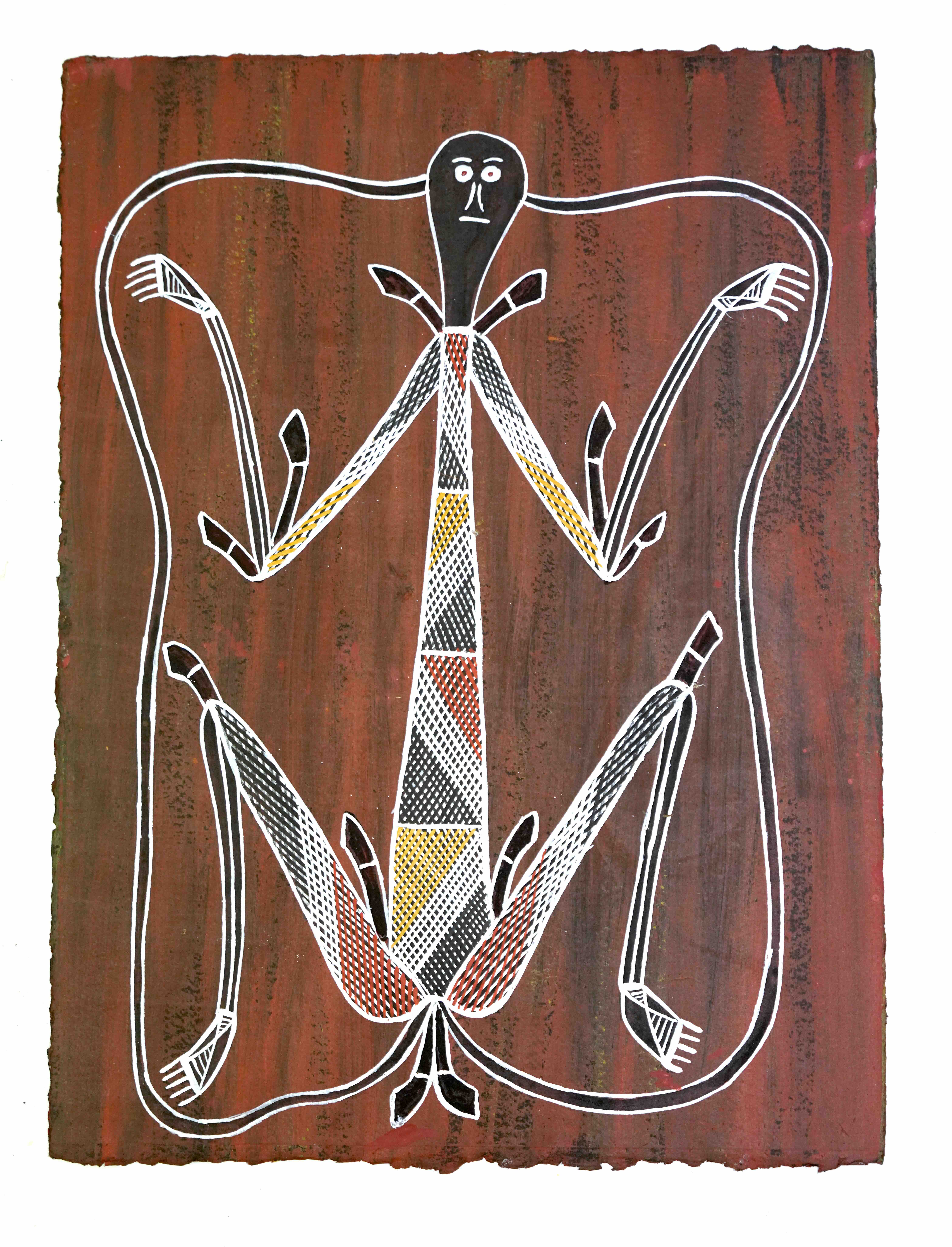Namarrkon, the Lightning Man, is an important ancestral being in the mythology of the Kunwinjku people of Western Arnhem Land. This spirit helped create the country during the Dreamtime. Namarrkon creates thunder by throwing stone axes down onto the earth. These axes can be seen protruding from various parts of his body, particularly the joints. An arc of lightning encircles his body. Namarrkon is especially active during December, when the season of kunumeleng is characterised by spectacular pre-monsoon storms and then from January to March during kudjewk, the ‘wet’ season in northern Australia. Namarrkon is also a guardian of the laws.